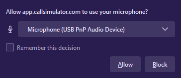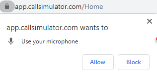 If this is the first time you have run a simulation, an in-browser popup will appear asking you to configure your microphone. Your chosen browser as well as your browser settings will determine what the popup looks like. To allow the simulation to start, you must allow the simulator to access your selected microphone. See also this article on testing your microphone and speaker settings.